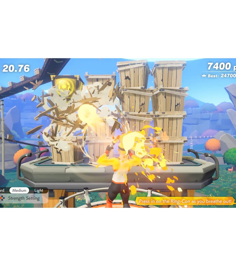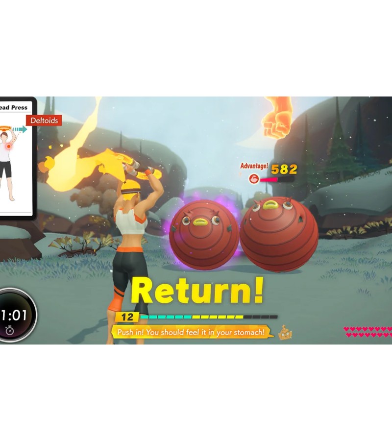 Traverse grass-swept plains by jogging in place, attack enemies with overhead shoulder presses, and refill your health meter by striking some yoga poses. Two new accessories, the Ring-Con™ and Leg Strap, measure your real-world actions and help turn them into in-game movements. With additional minigames and customizable workout routines, Ring Fit Adventure is great escape for players of all skill levels and schedules.In Adventure mode, defeat enemies with attacks based on real-world exercises as you traverse more than 100 levels in over 20 worlds. As you work through each level (and possibly work up a sweat), you’ll earn experience points. Between fights, you may encounter some unusual methods of transportation such as squat-powered launch pads. Then, pass around the Ring-Con and leg strap accessories and select from a few minigames: break boxes with gusts of air, craft pottery using squats, and more.